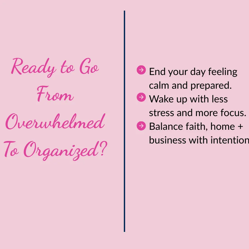 Then I started my online business from home. I learned very quickly that there are a million more tasks to do. So I applied this same concept I was using for my home tasks to my new business tasks, And this is how The Organized Mompreneur came to be. A way for me to help other moms starting businesses from home feel less overwhelmed and more organized In all the areas of her life. Her faith, her family, her home and her business So you can thrive in every area of life - with more grace, less hustle, and God at the center..
